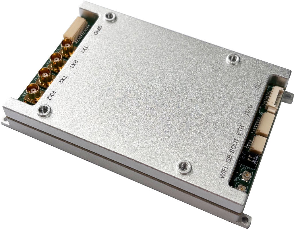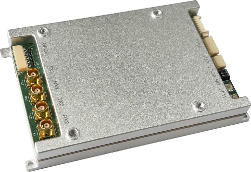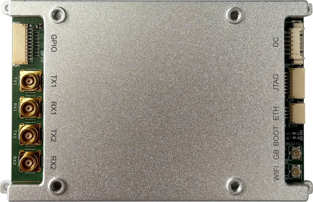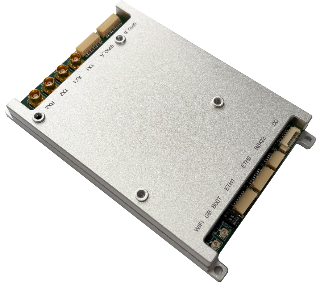 型号C1:尺寸仅为59*88mm,适用于无人机组网、宽带数据传输等应用场景。支持双发双收,支持2.4/5.8GHz WiFi,支持北斗/GPS定位,具备1个以太网口,2个RS232串口及多个GPIO,集成32MB Quad SPI Flash,可通过FPC排线支持SD卡,便于用户开发。