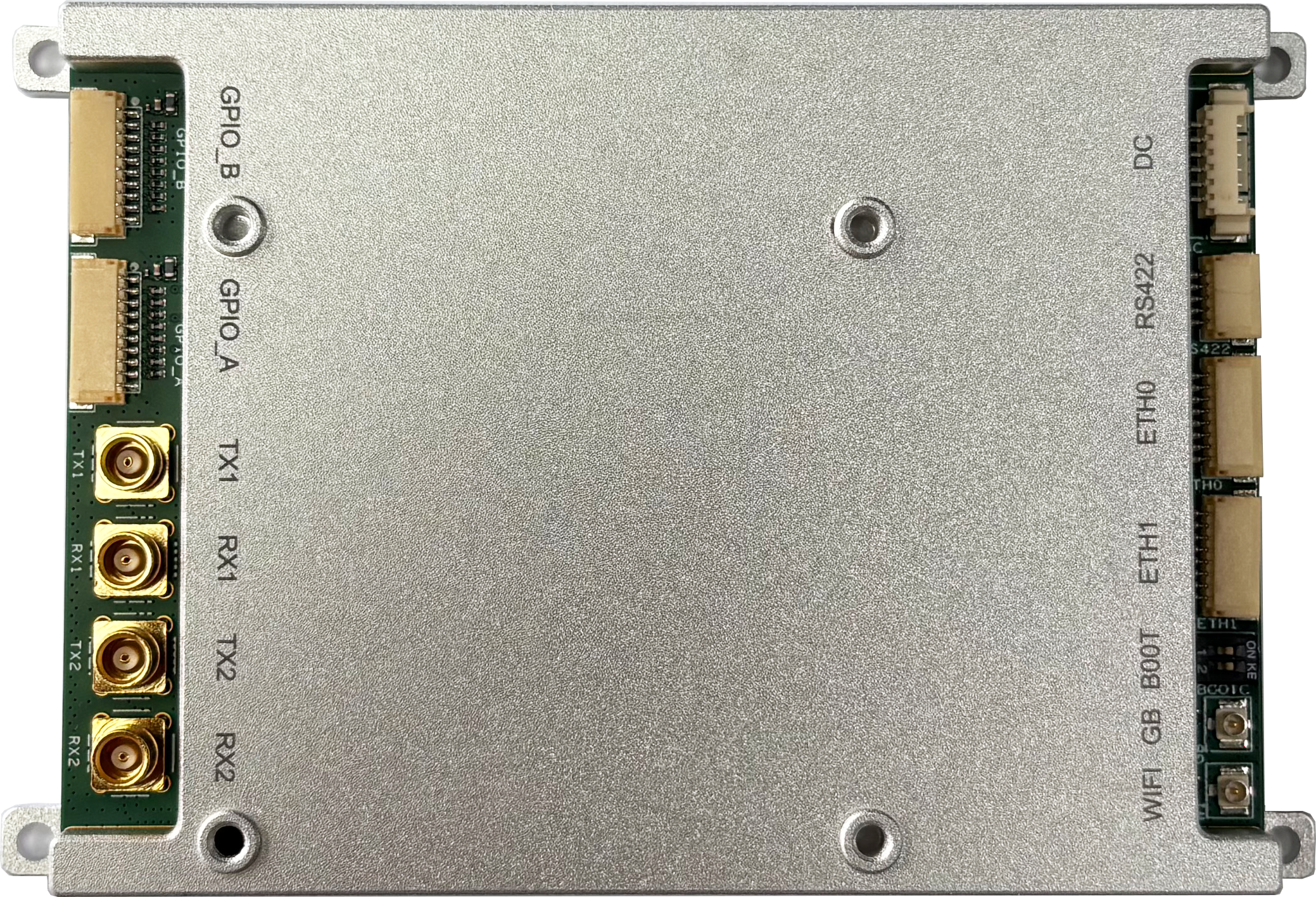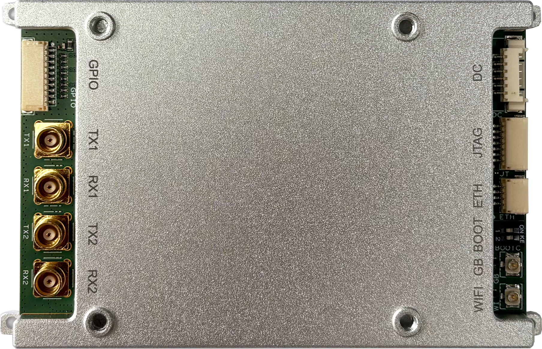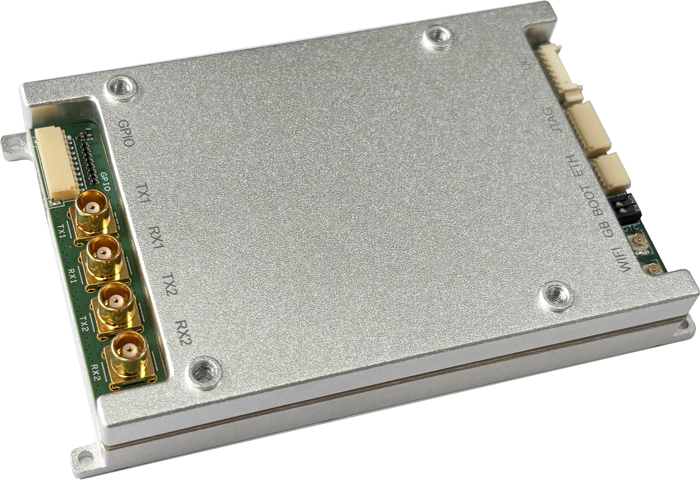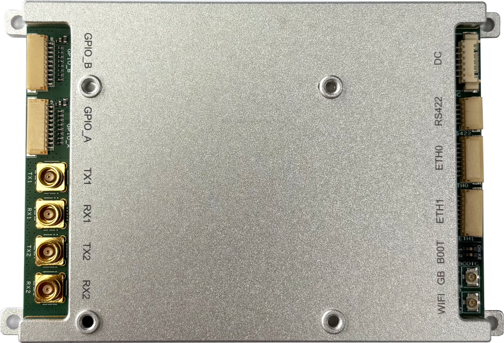 型号C2:尺寸为100*73mm,适用于背负式自组网电台、车载自组网电台等设备形态。支持双发双收,支持2.4/5.8GHz WiFi,支持北斗/GPS定位,具备2个以太网口、1个RS232串口、1个RS422串口及多个GPIO,集成32MB Quad SPI Flash与8GB eMMC,可通过FPC排线支持SD卡,便于用户开发。